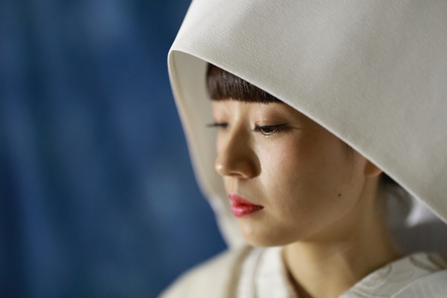 怒りを象徴する角を隠し、従順でしとやかな妻になるという意味が込められています。文金高島田などの日本髪に合わせるのが一般的です。角隠しを着用する場合は、髪型がしっかりと見えるため、日本髪の美しいシルエットが際立ちます。