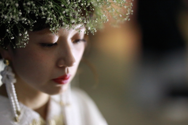 挙式が終わるまで新郎以外の人に顔を見られないようにするという意味合いがあり、白無垢の時のみ着用できます。綿帽子は、すっぽりと頭を覆うため、合わせる髪型は比較的自由度が高いですが、洋髪の場合は、綿帽子の内側に収まりやすいように、あまりボリュームを出しすぎないコンパクトなまとめ髪がおすすめです。白無垢 綿帽子 洋髪の組み合わせも人気があります。