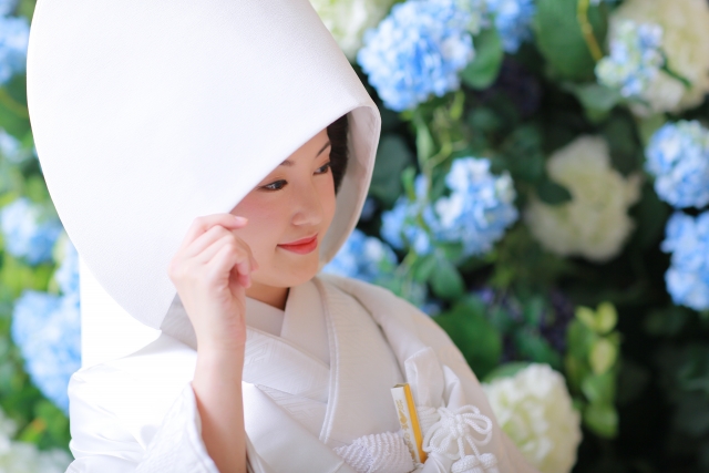 白無垢を着る際に合わせる伝統的な被り物として、「綿帽子(わたぼうし)」と「角隠し(つのかくし)」があります。これらを美しく見せるためには、髪型とのバランスが重要です。